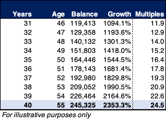 In 10 years, or when young Timothy reaches 25, he would have $22,255, or 2.2 times the money. Then it gets better and better. When Timothy becomes 35 years old, the original $10,000 becomes $49,530, or 5 times the money. You can see, the money more than doubles every 10 years. And it continues to grow; when Timothy reached the age of 65, this $10,000 has compounded to $545,982, or 54.6 times the original $10,000! And because it is in a Roth IRA, Timothy can then take out the money without paying any taxes.